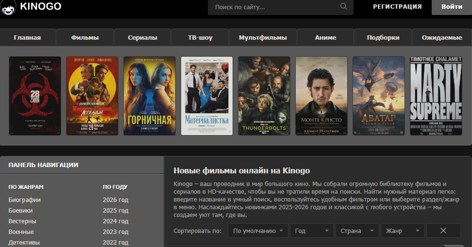 Kinogo – популярный медиасервис с огромным выбором кино, сериалов и мультфильмов на любой вкус. Здесь можно бесплатно посмотреть как новинки мирового кинематографа, так и шедевры прошлых лет. Достаточно найти понравившийся фильм, выбрать плеер и звуковую дорожку, а затем наслаждаться высококачественным контентом.