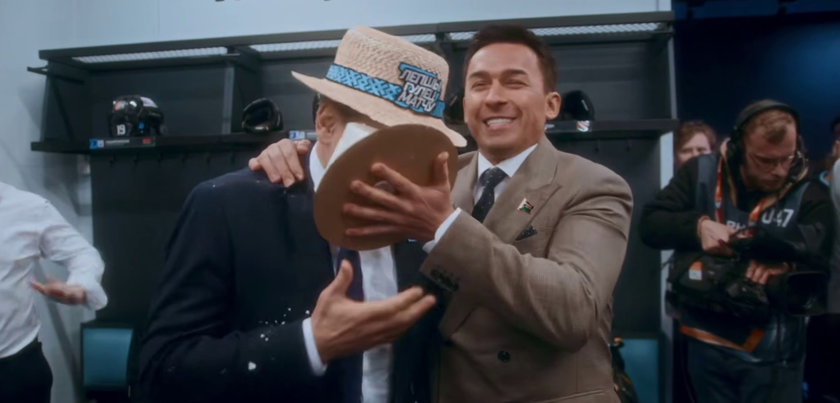 Сразу после победной встречи с московскими одноклубниками в раздевалке команды сенатор Дмитрий Басков ударил наставника тортом по лицу, став инициатором шуточного розыгрыша.