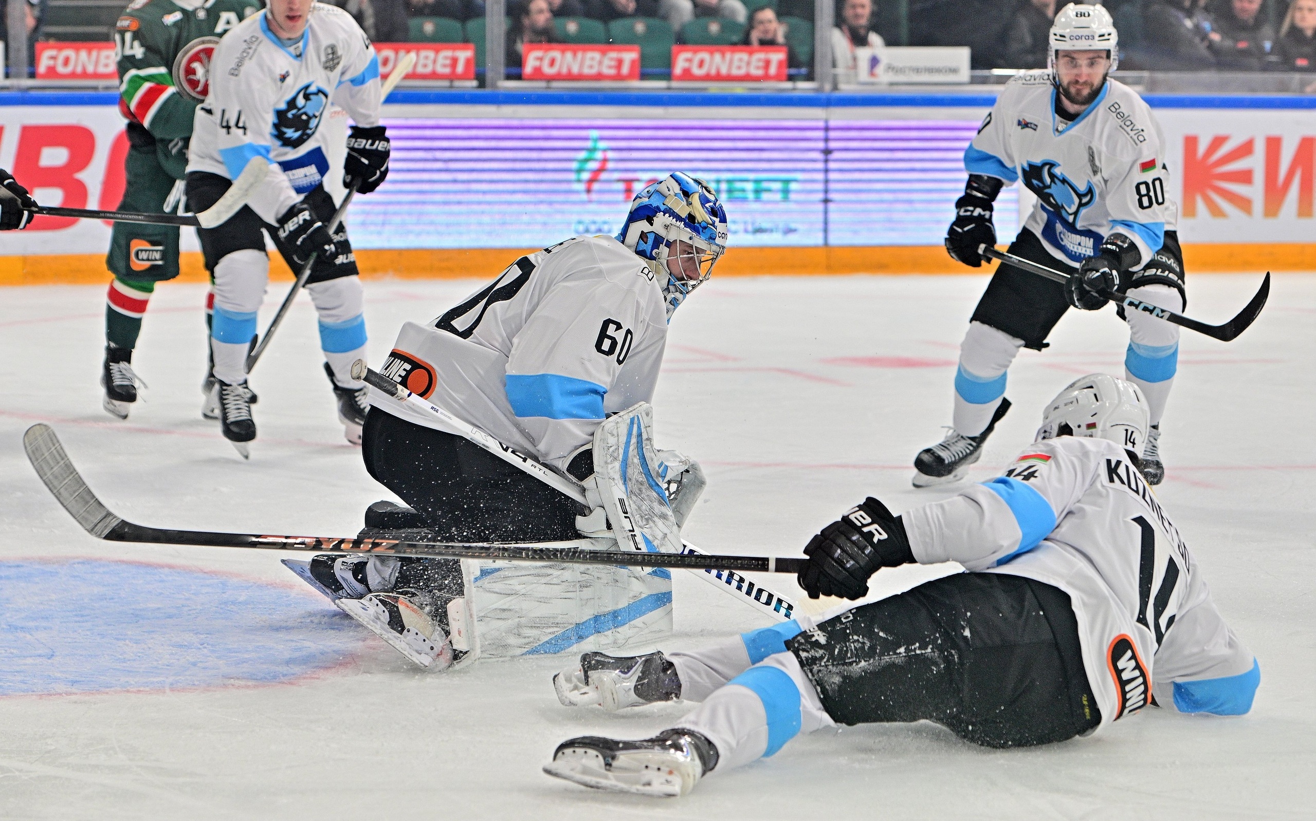 Защитники-крепыши Фальковский, Лямкин, Карпухин, Марченко на протяжении двух периодов не давали «зубрам» разбежаться. Сложилось впечатление, что даже ультраоборонительный «Локомотив» так не вязал при защите своих ворот. А взгляните на центральную ось нападения «зеленых»: Семенов, Яшкин, Хмелевски, Фисенко. Это признанные мастера лиги, доходившие до финала Кубка Гагарина.