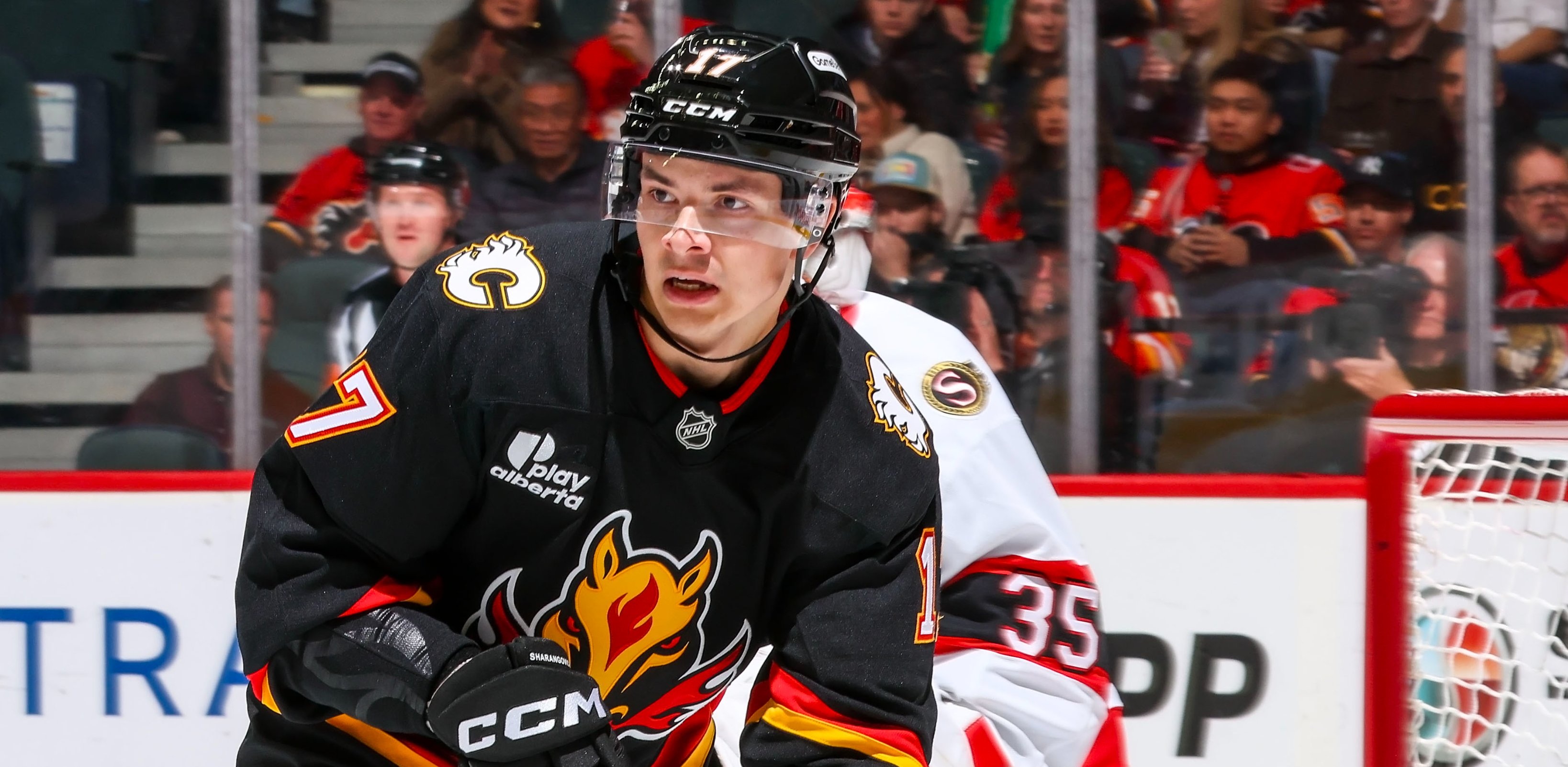 27-летний белорусский нападающий «Калгари» Егор Шарангович вышел на лёд на левом фланге третьего звена. Его партнёрами стали Морган Фрост и Матвей Гридин.